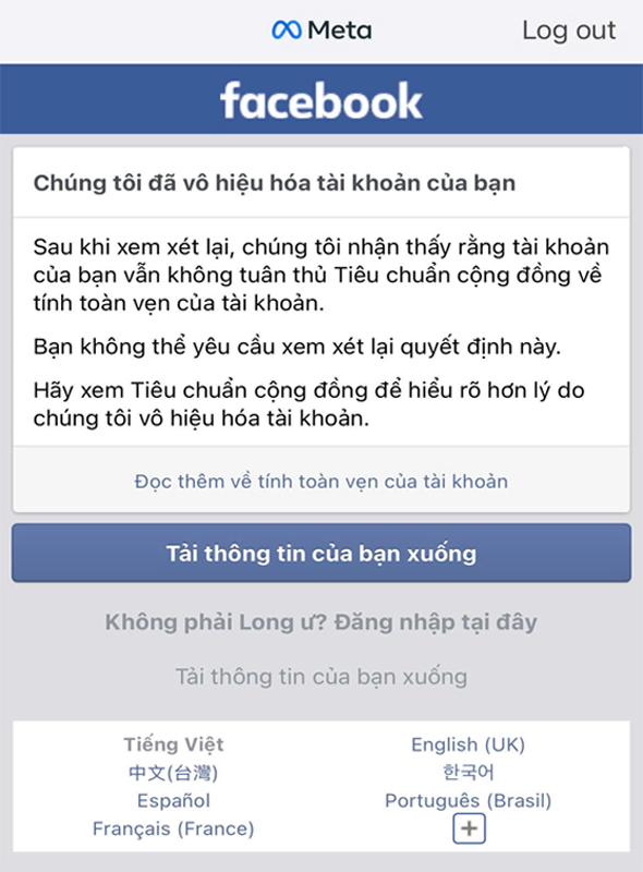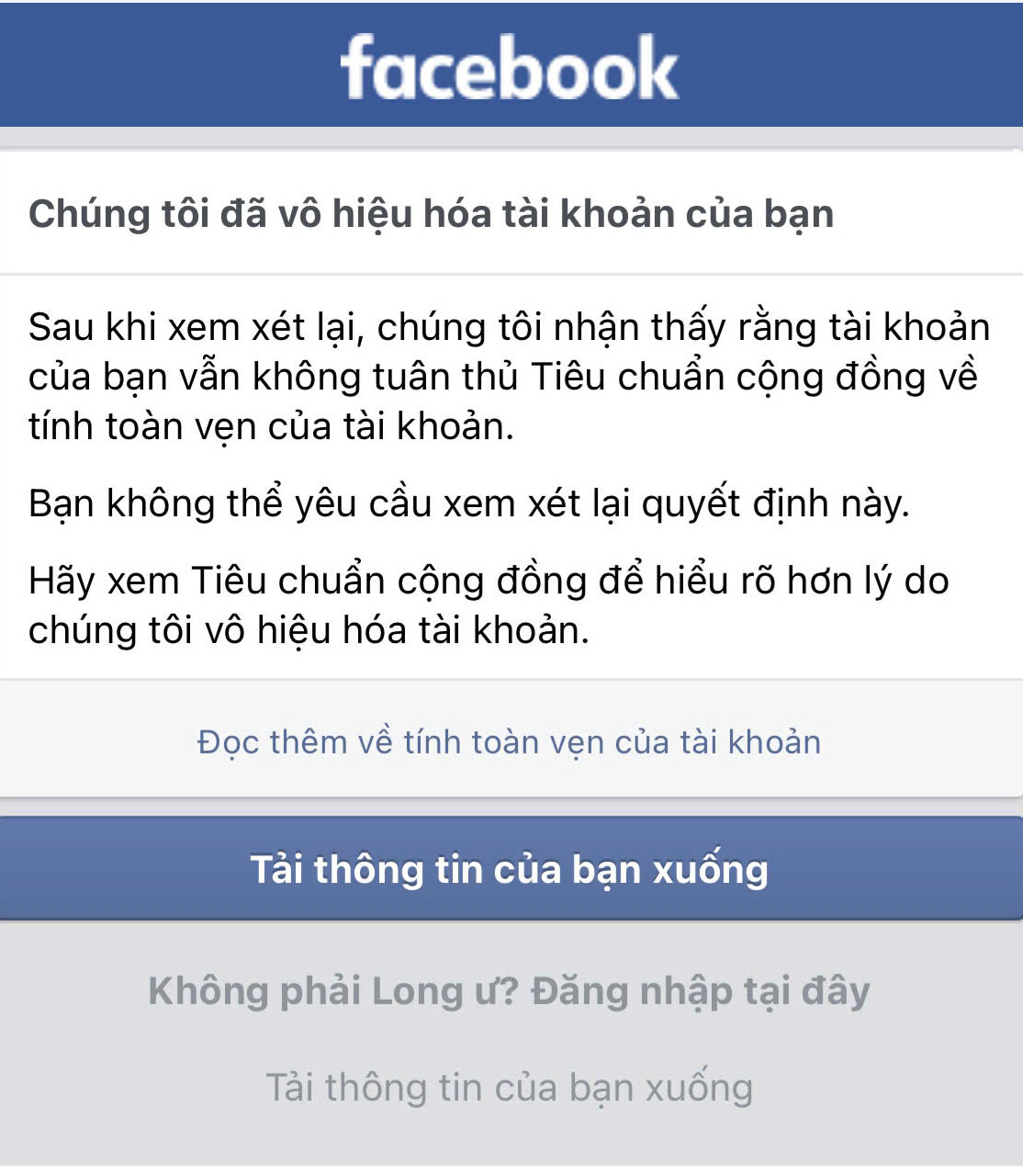 • Dấu hiệu: Bạn đăng nhập nhưng Facebook hiện dòng chữ “Tài khoản bị vô hiệu hoá” và có nút Tải thông tin của bạn xuống.