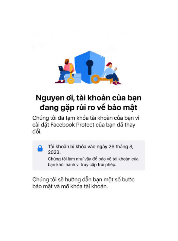 Nguyên nhân: Do cài đặt Facebook Protect của bạn đã thay đổi, để bảo vệ tài khoản khỏi hành vi truy cập trái phép.