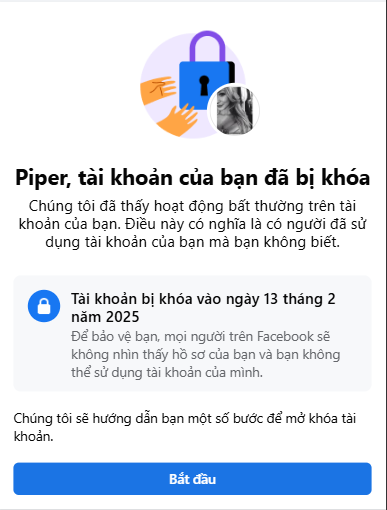 Dấu hiệu:Tài khoản Facebook bị tạm khóa có nút “Bắt đầu” để tiến hành xác minh.